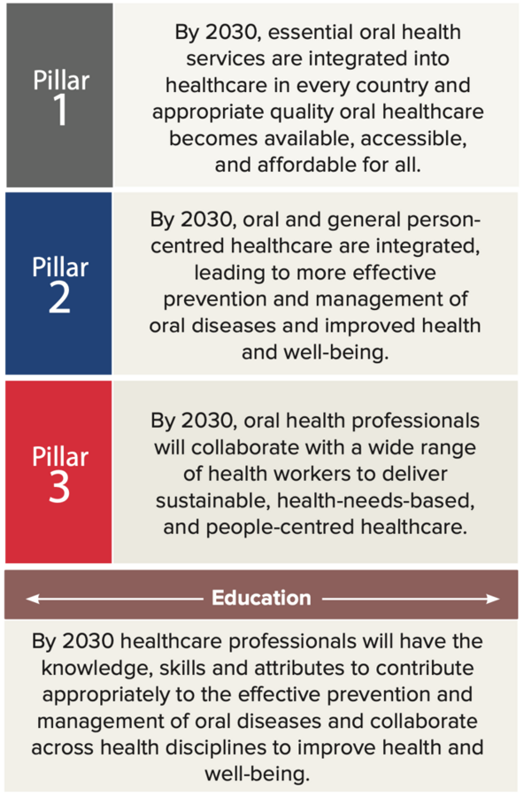 Three pillars, each with a major goal, represent a strategy for education that will create a responsive and resilient profession with the knowledge and skills to lead systems reforms. According to FDI, education and training in public health will enable healthcare professionals to contribute more effectively to the population-wide prevention of oral disease. It will also enable them to play a central role in dealing with possible future public health emergencies similar to the recent COVID-19 pandemic.