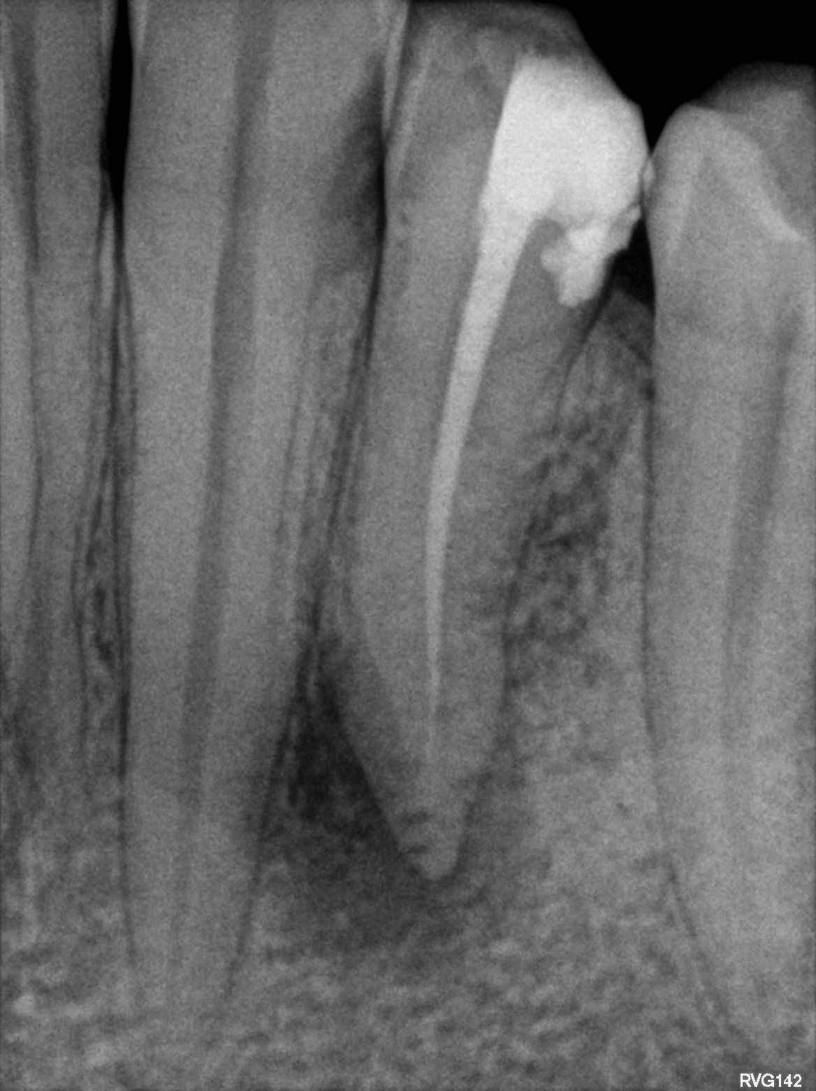 A patient presented with a large draining buccal abscess that showed a large peri apical lesion with an incompletely obturated canal on the pre-operative intraoral radiograph.