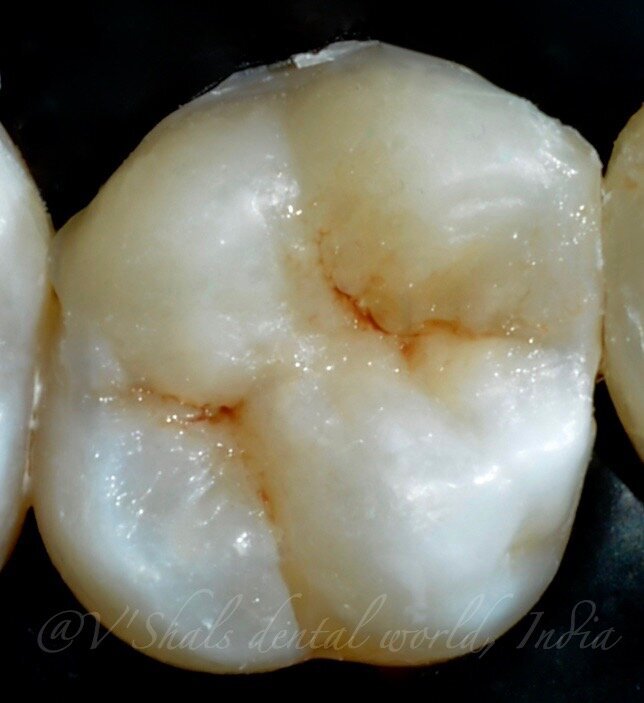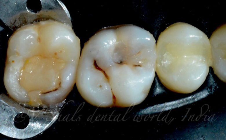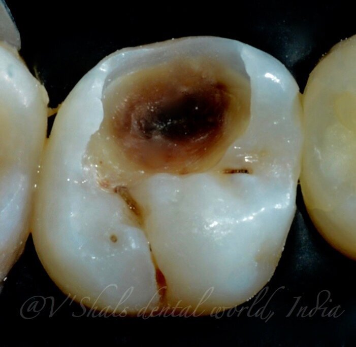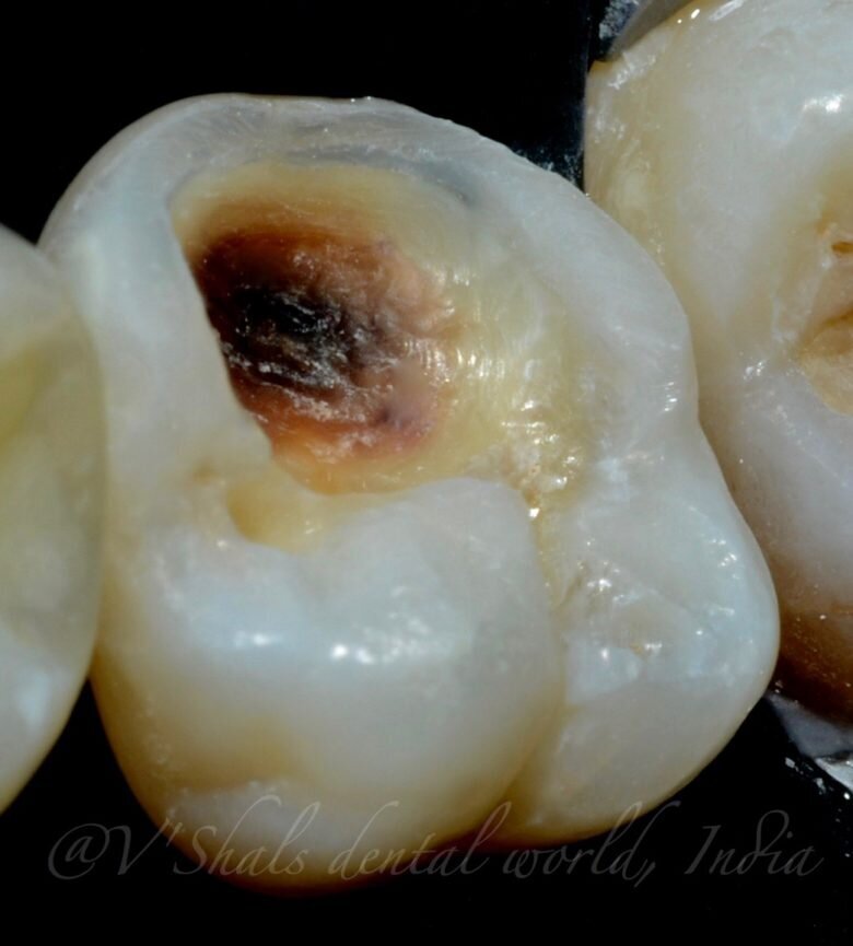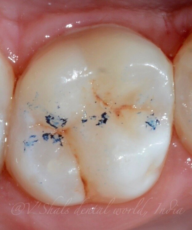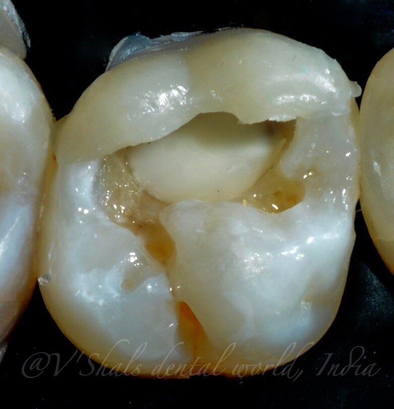 Fig. 4 - The cavity is cleaned till affected dentin is reached and confirmed with chemical dye check and with sharp spoon excavator, the weak cusps are reduced .