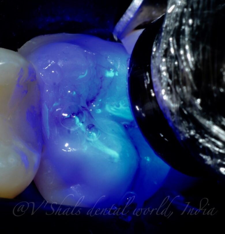 Fig.7- The composite is placed on the custom shield and adapted on to the tooth and photo-cured.