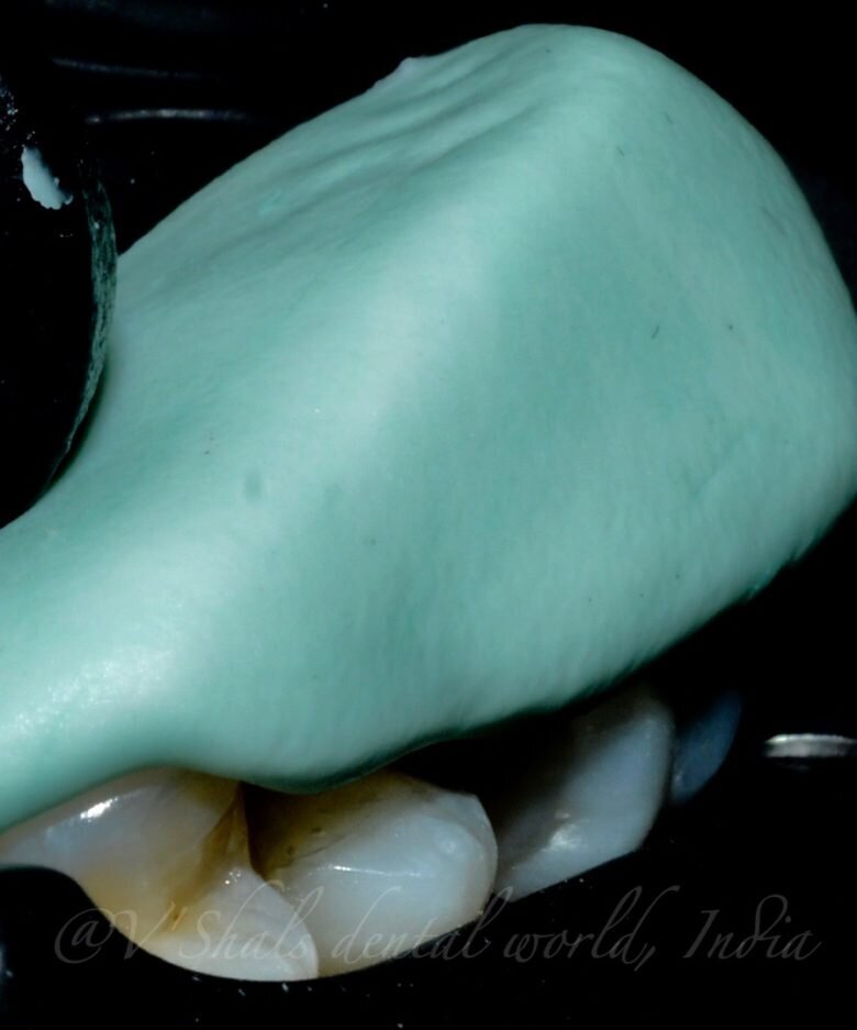 Fig. 3 - The custom shield is made by placing a small amount of putty material buccally and occlusally.