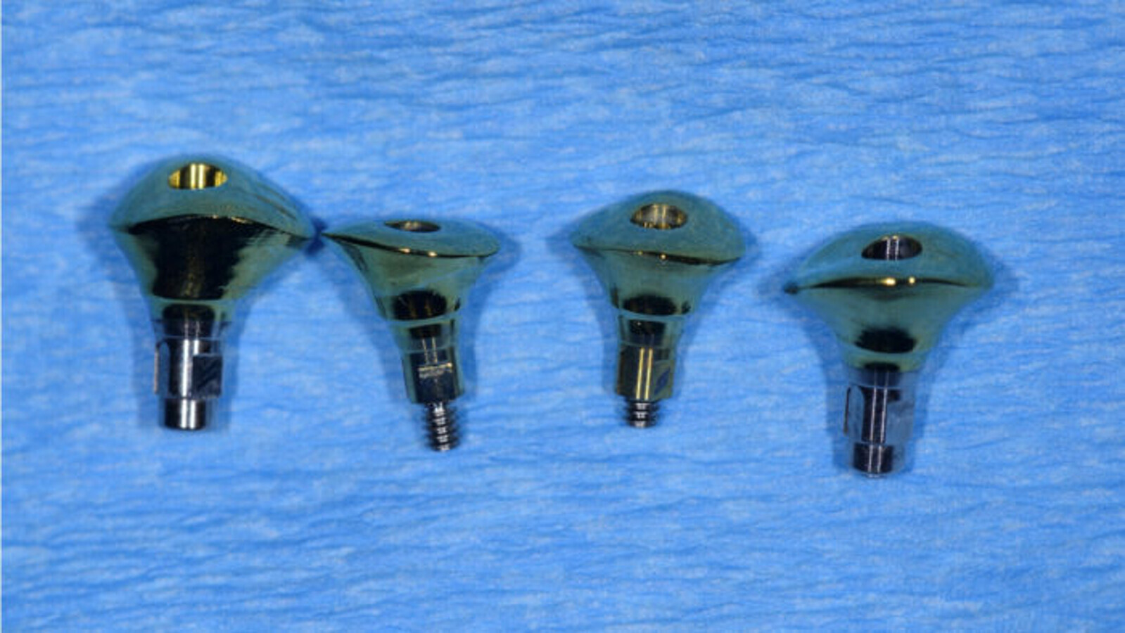 Gold nitride custom healing abutments milled in titanium on a Straumann M Series mill. (Image: Dr Joseph S. Kim)