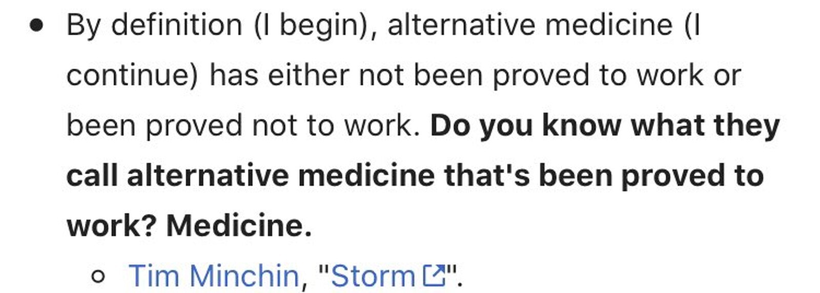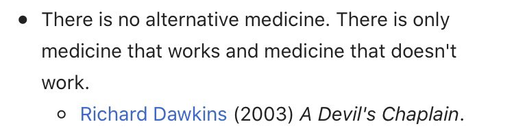 3. Richard Dawkins has one about there being no such thing as alternative medicine. If it works, it’s just medicine. If it doesn’t, it isn’t.