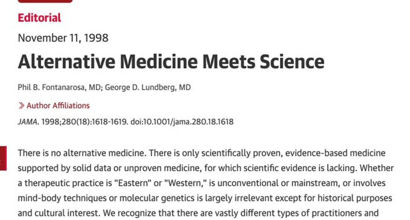 2. Quoting an editorial from Phil Fontanarosa and George Lundberg (JAMA 1998) "There is no alternative medicine. There are only two types of medicine. It is either scientifically proven, evidence-based medicine supported by data or unproven medicine, for which scientific evidence is lacking. Eastern vs western, mainstream vs unconventional etc are only for historical purposes and cultural interest.