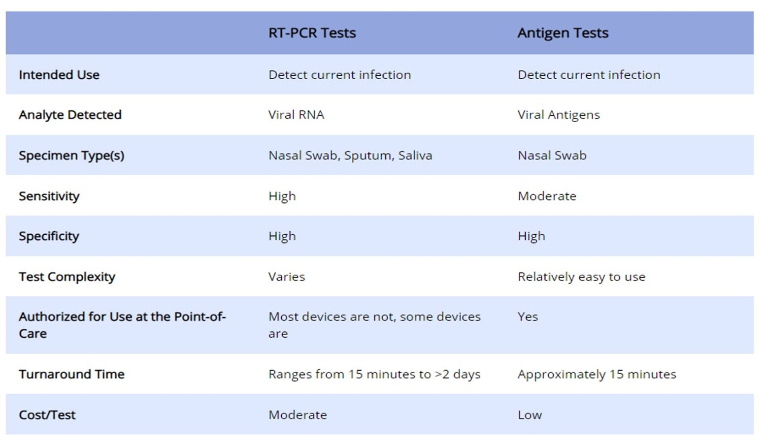 Antigen tests typically have high specificity (99.3%- 100%) and low sensitivity (50.6% to 84%)
