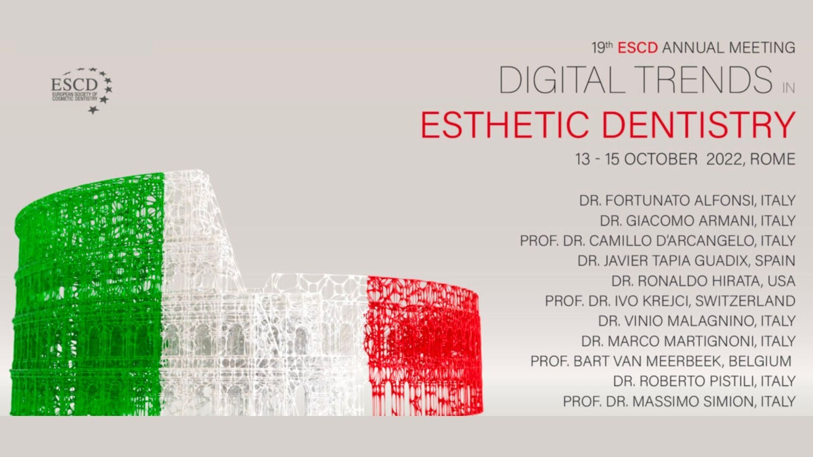 “Be a part of the great big ESCD family and experience amazing knowledge sharing and the opportunity to build beautiful friendships with like-minded colleagues from different countries. Our Annual Meeting, organized in the beautiful historic city of Rome this year, promises a great event with something for everyone. So, join us in Rome this October for an amazing session in Aesthetic Dentistry.”