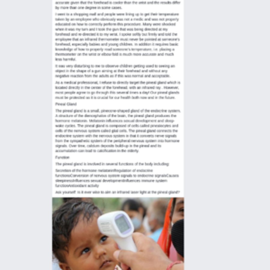 [4] As a medical professional, I refuse to directly target the pineal gland which is located directly in the center of the forehead, with an infrared ray. Our pineal glands must be protected as it is crucial for our health both now and in the future.