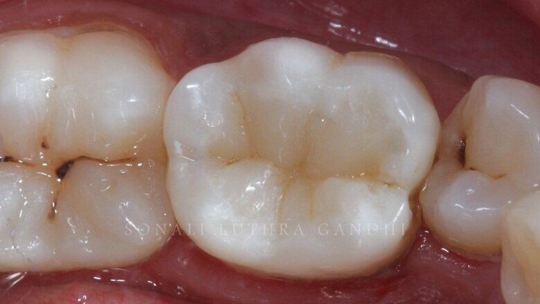A young 16-year-old girl entered the operatory with the chief complaint of pain in her lower left tooth. On radiographic and clinical analysis, tooth number 36 presented with a huge decay extending upto the pulp and the tooth required endodontic therapy. The patient also showed misaligned teeth and was suggested orthodontic treatment. The patient agreed for the same. As the tooth had sufficient amount (2mm) of enamel all around (the proximal walls and the buccal and lingual walls intact), the treatment plan devised was to do a direct composite restoration instead of cuspal coverage. This treatment would save a lot of tooth structure and increase the longevity of this tooth. This would also help the orthodontist to bond on to enamel rather than ceramic. The patient was informed that this restoration is an interim restoration and in future this tooth would require cuspal coverage.
