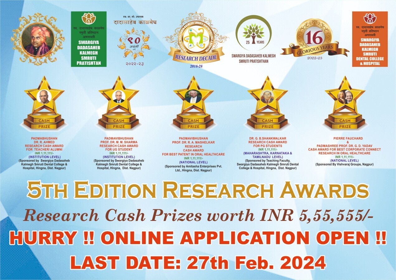 This article from Dr. Nilesh Pardhe, the Dean of Swargiya Dadasaheb Kalmegh Smruti Dental College & Hospital, (SDKSDCH) Hingna, District Nagpur is a guest editorial to announce the fifth edition of “Research Cash Awards in Oral Healthcare” to motivate and support dental students to excel in their various pursuits in dentistry.