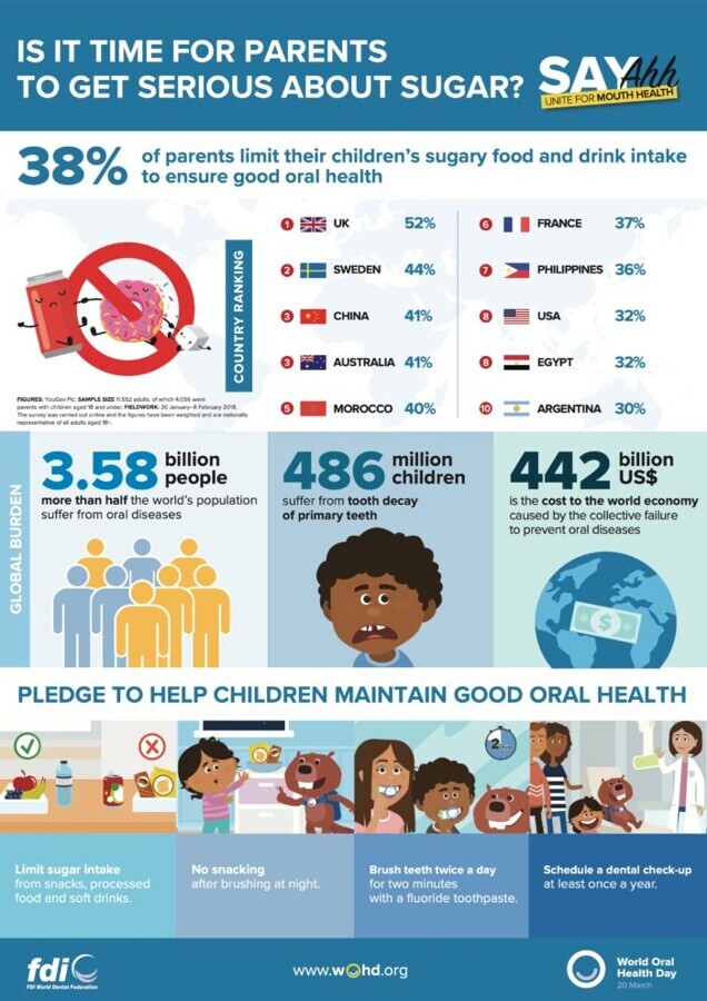 GENEVA, Switzerland: In light of World Oral Health Day (WOHD), which is being celebrated around the world today on 20 March 2020, FDI World Dental Federation released new statistics on the willingness of parents to limit their children’s sugar intake to ensure good oral health. The global survey, which was carried out by YouGov and commissioned by FDI, showed that less than half of parents proactively limit their children’s intake of sweets, carbonated soft drinks and juice as a means of protecting their teeth.