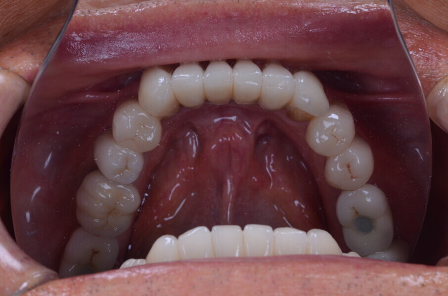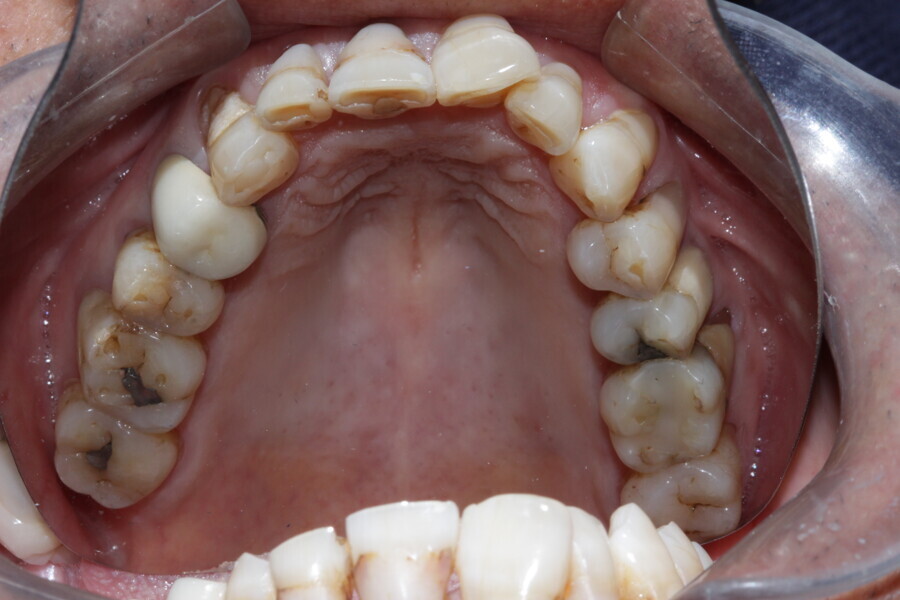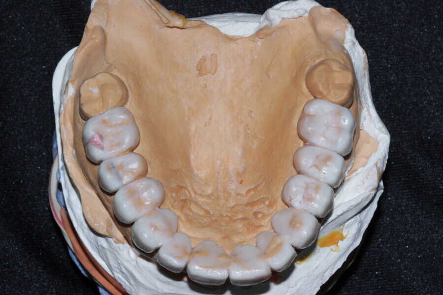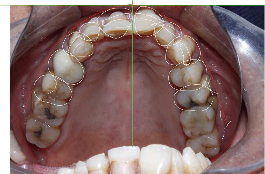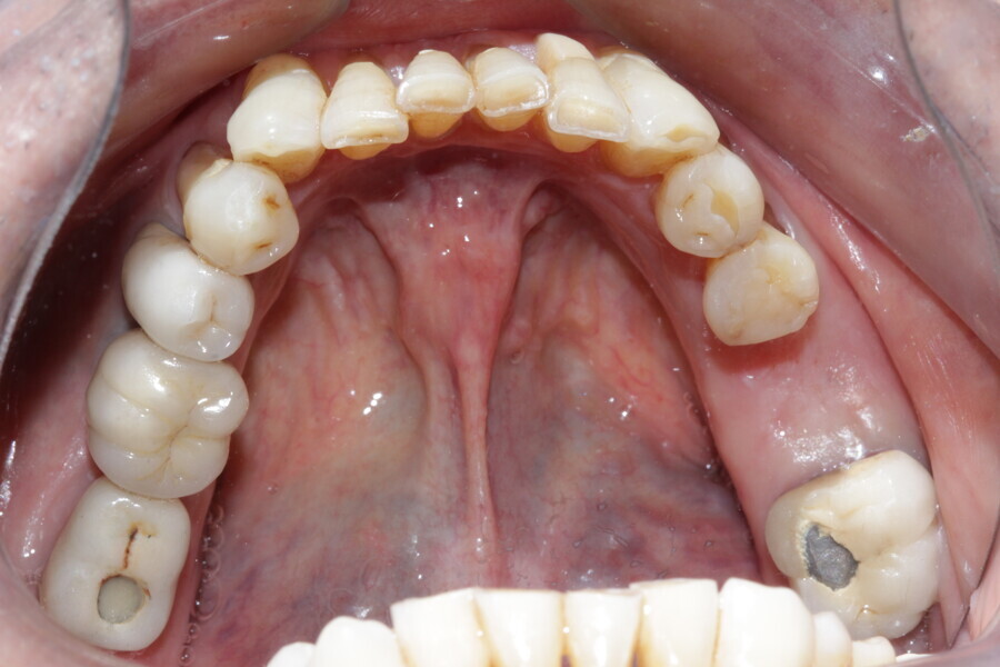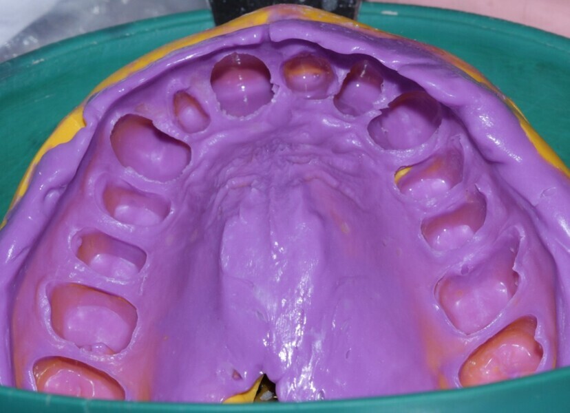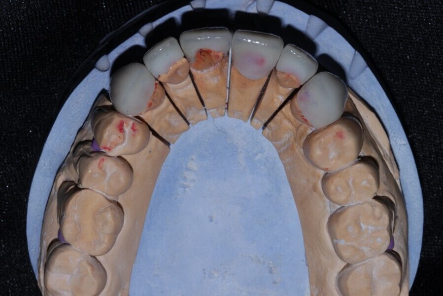 Figure 21 Palatal view of upper anterior emax 2 layered restorations all veneers except 21