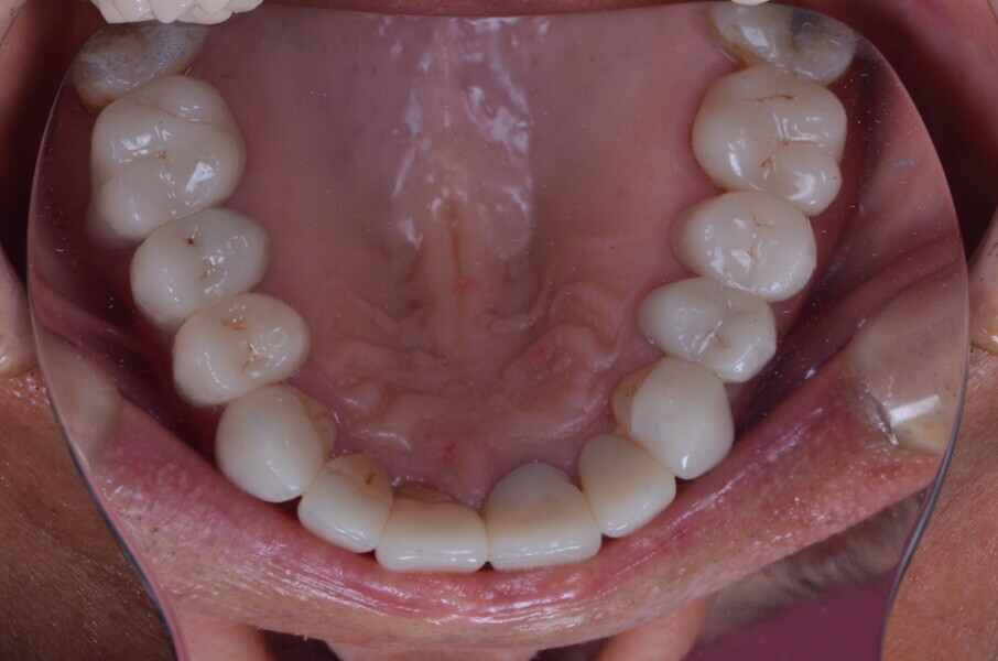 Figure 22 lingual view of lower anterior emax 2 layered restorations( to close interdental spaces we planned crowns)